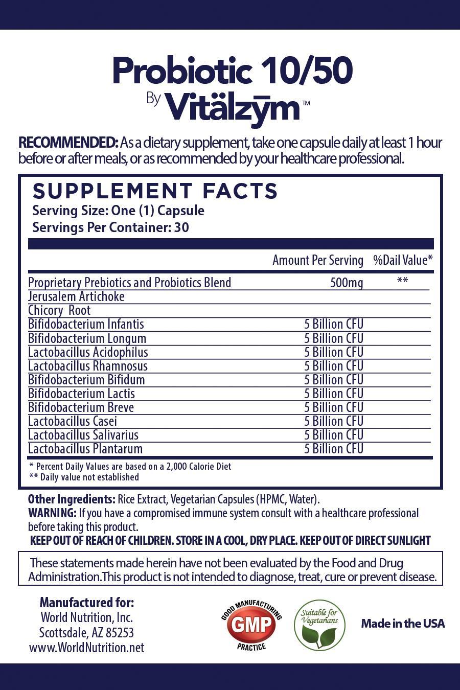 Probiotic 10/50 by Vitälzӯm® is uniquely formulated with a powerful combination of the 10 most clinically researched probiotic strains in a potent concentration of 50 billion CFU (colony forming units). Probiotic 10/50 utilizes delayed release to allow five of the 10 strains to target the upper GI tract and the remaining five to target the lower GI tract. This allows for maximum absorption and benefit.